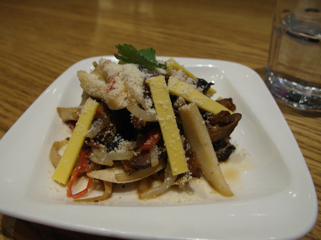 這道利用各種菇類不同的口感集結在一起加上鹹鹹的起司粉涼拌的微辣口味