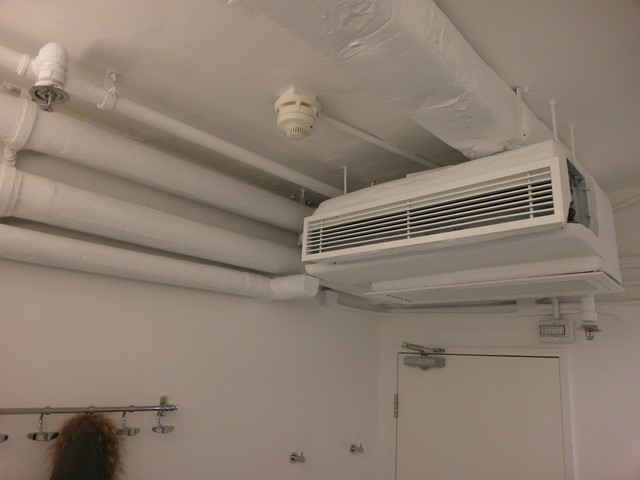 他們的天花板式完全沒有修飾的,所有的管線拉 緊急滅火水閘都露在外面