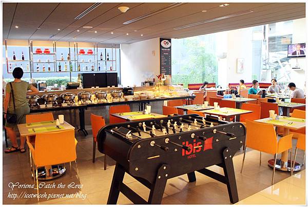 搭電梯check out 時 正走出大門會經過的用餐區及一個娛樂用的小型足球擂台